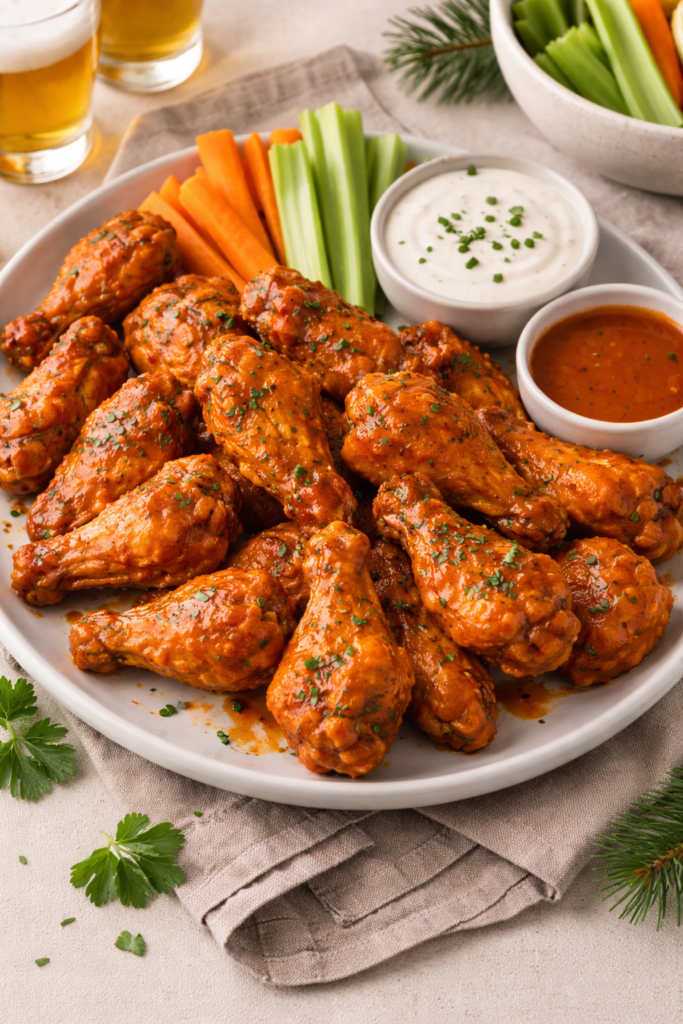 Transfer baked wings to a large bowl and pour Buffalo sauce over them. Toss until fully coated. - Serve:
